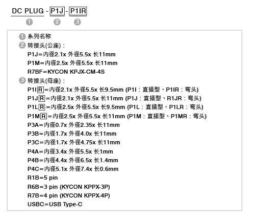 - DC PLUG-P1J-P1M / DC PLUG-P1J-P1I / DC PLUG-P1J-P1L / DC PLUG-P1J-P3A / DC PLUG-P1J-P3B / DC PLUG-P1J-P3C / DC PLUG-P1J-P4A / DC PLUG-P1J-P4B / DC PLUG-P1J-P4C / DC PLUG-P1J-P1IR / DC PLUG-P1J-P1MR / DC PLUG-P1J-P1LR / DC PLUG-P1J-P1JR / DC PLUG-P1J-R1B / DC PLUG-P1J-R6B / DC PLUG-P1J-R7B / DC PLUG-P1J-USBC